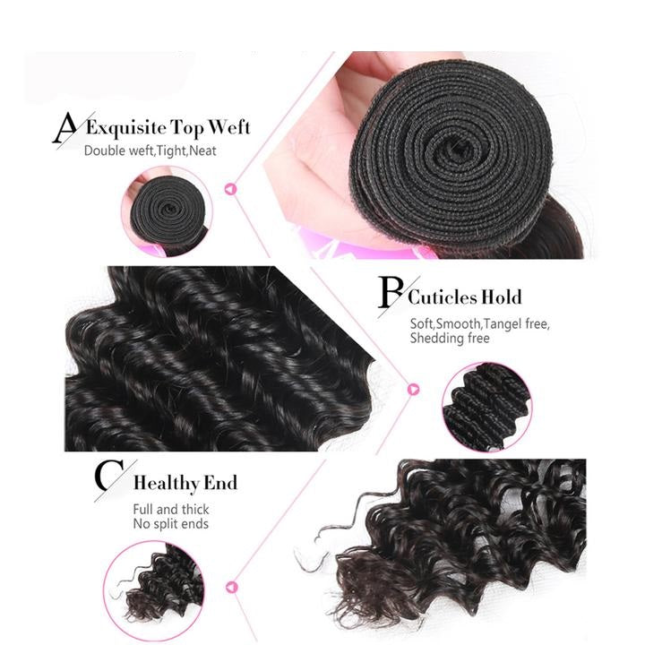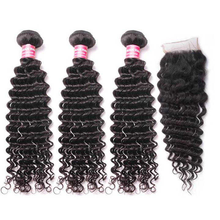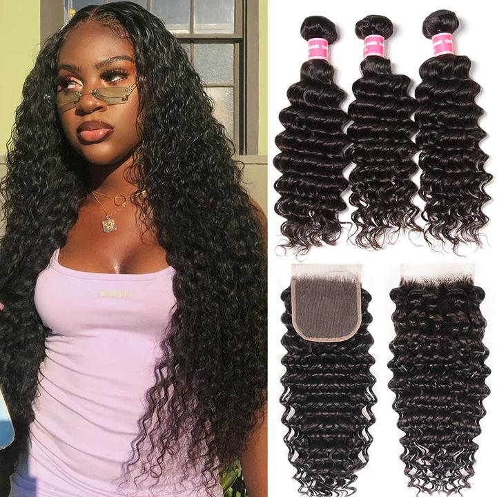 Lanfy Hair Brazilian Deep Wave Human Hair 3 Bundles with 4*4 Lace Closure Wig